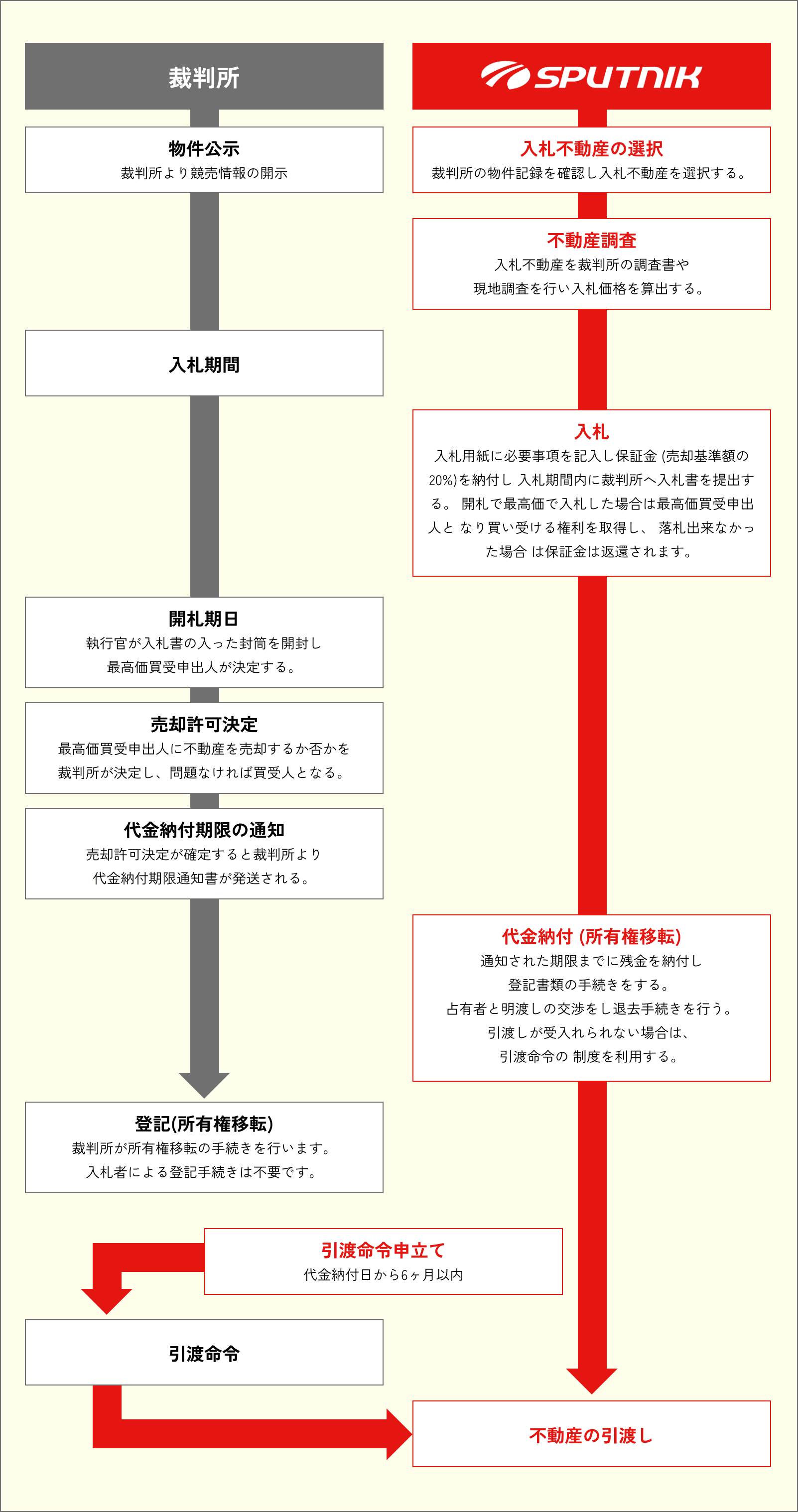 - 民事執行法に基づき、債権回収のために債権者が裁判所に対して申立てを行い、その不動産を裁判所が売却する手続きです。競売市場修正と言われ、通常の不動産取引の相場価格よりも2~3割程安く取得出来る事があります。